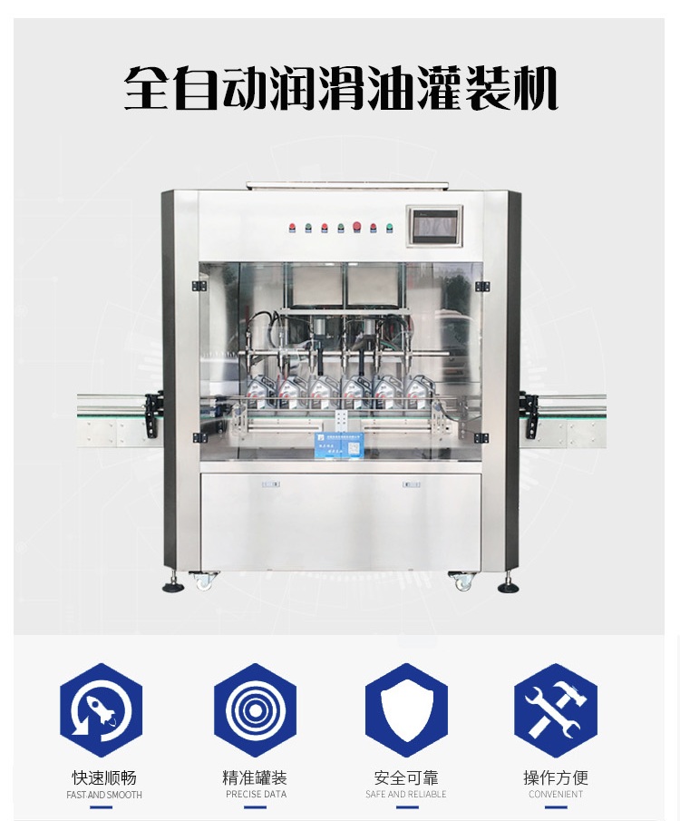 該六頭柱塞式全自動(dòng)潤滑油灌裝機(jī)特的灌裝頭設(shè)計(jì)及真空回吸系統(tǒng),確保灌裝過程無殘油滴漏,快慢雙速灌裝,灌裝速度可調(diào),杜絕溢瓶現(xiàn)象。該機(jī)采用動(dòng)力灌裝,無需配裝高位罐,簡化了安裝工序,提高了灌裝效率。履帶式壓蓋機(jī),穩(wěn)定無噪音,無空壓現(xiàn)象。觸摸屏界面友好,操作簡捷,SIEMENS PLC控制系統(tǒng),運(yùn)算速度快,性能穩(wěn)定,品質(zhì)卓越。電、氣件均采用精品元件,確保整機(jī)運(yùn)作穩(wěn)定。