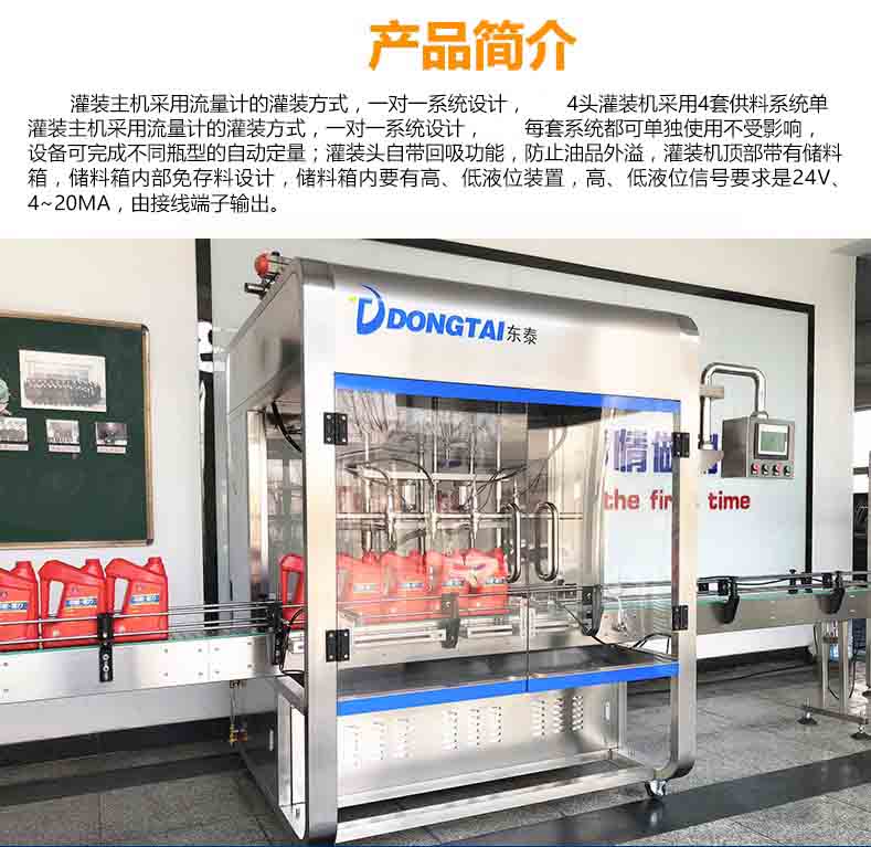 全自動(dòng)潤(rùn)滑油灌裝主機(jī)采用流量計(jì)的灌裝方式,一對(duì)一系統(tǒng)設(shè)計(jì),4頭灌裝機(jī)采用4套供料系統(tǒng)單灌裝主機(jī)采用流量計(jì)的灌裝方式