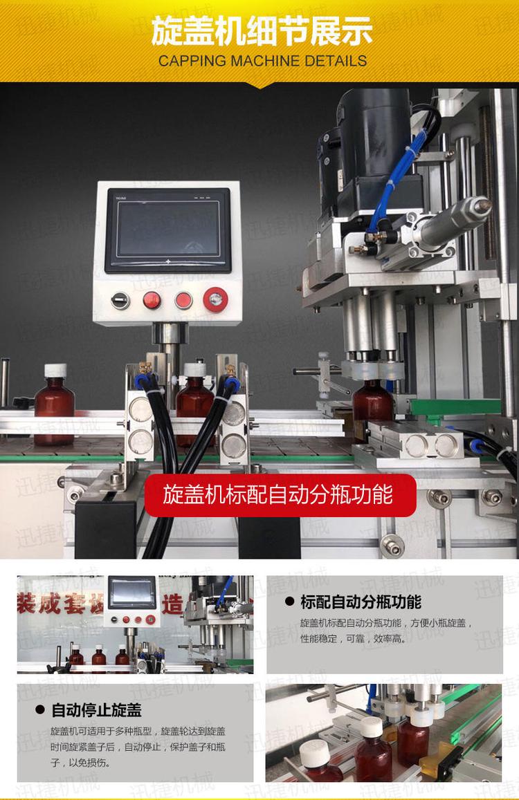 4、塑料瓶消毒水灌裝機 小玻璃瓶溶液灌裝機的旋蓋機部分可適用于多種瓶型,旋蓋輪達到旋蓋時間旋緊蓋子后,自動停止,保護蓋子和瓶子,以免損傷。