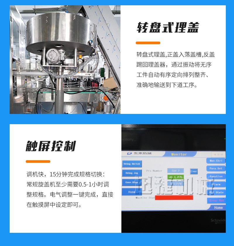 2、品質(zhì)高:跟隨式旋蓋,旋蓋過程不停頓,不晃液,不污染瓶口、瓶身及輸送帶,確