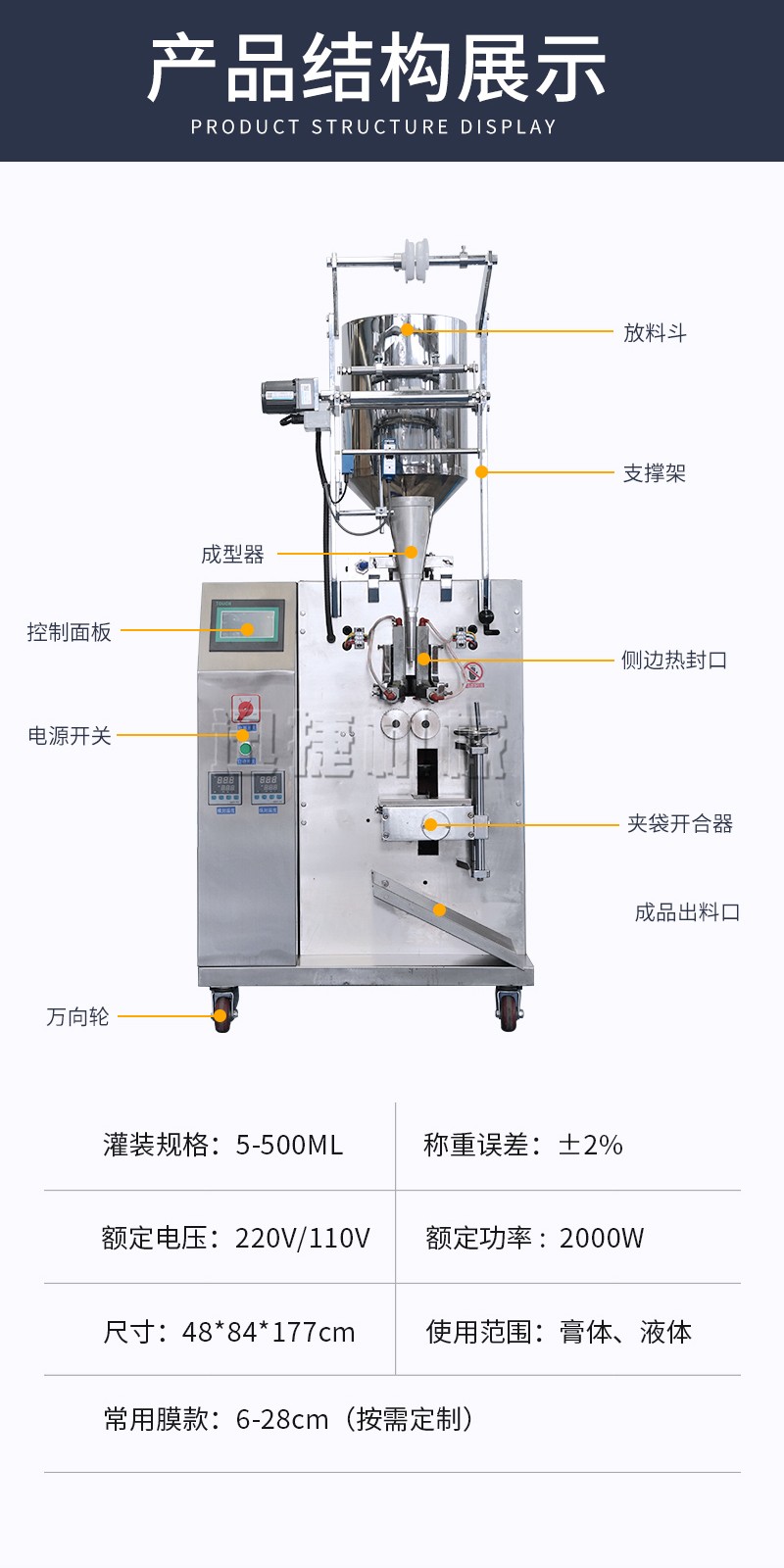 光電跟蹤及無(wú)極調(diào)速于一體,可周期完成下料、計(jì)量、日期打印、制袋、充填、封合、熱壓批號(hào)、分切計(jì)數(shù)等作業(yè)。