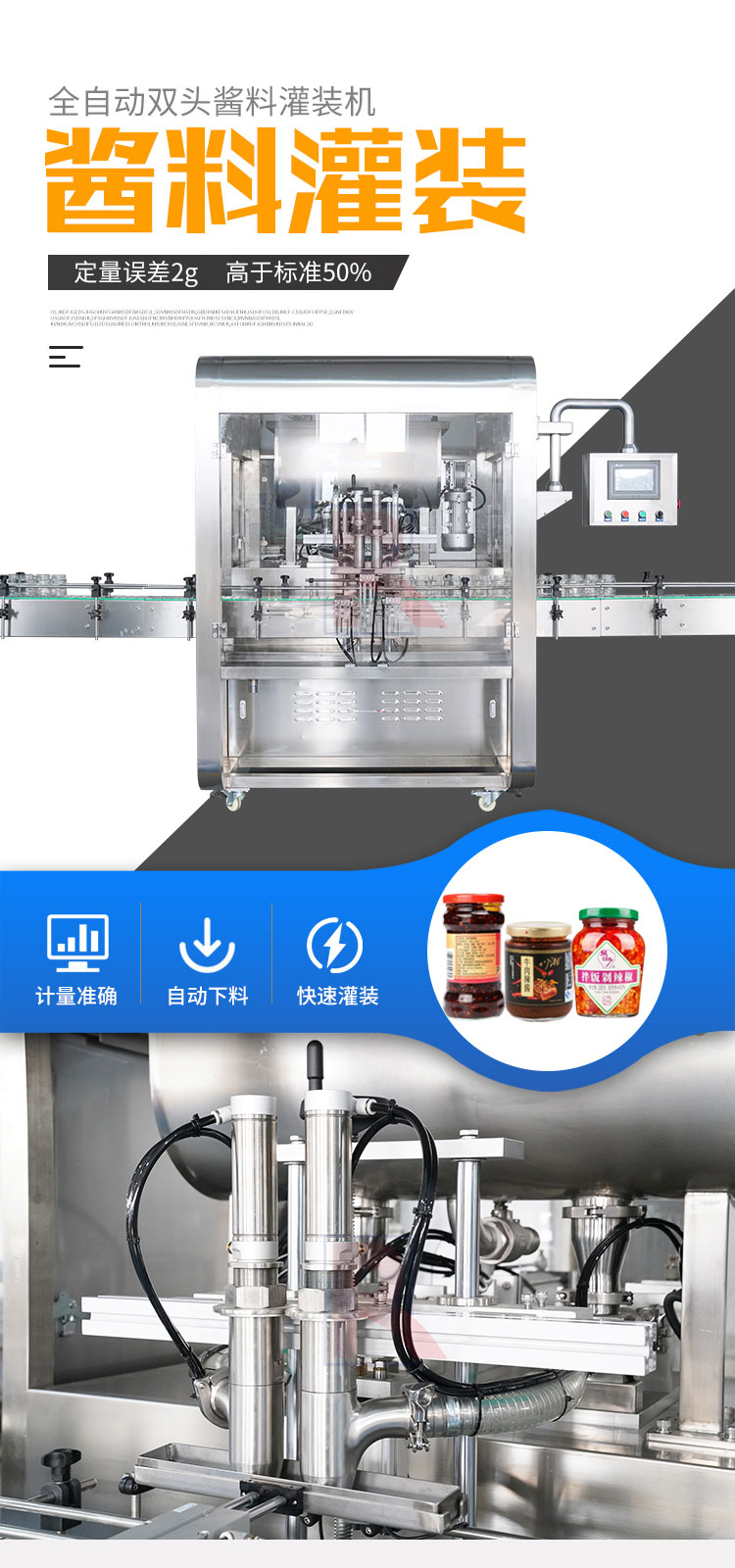 雙頭醬料灌裝機(jī)適用于調(diào)味品中帶顆粒并且濃度較大的香菇醬、豆瓣醬、花生醬、芝麻醬、果醬、牛油火鍋底料等醬類(lèi)的灌裝。
